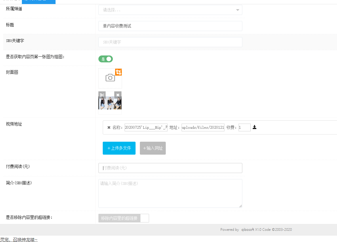 今天在新安装X1后添加上增强版cms 上传视频 选择收费