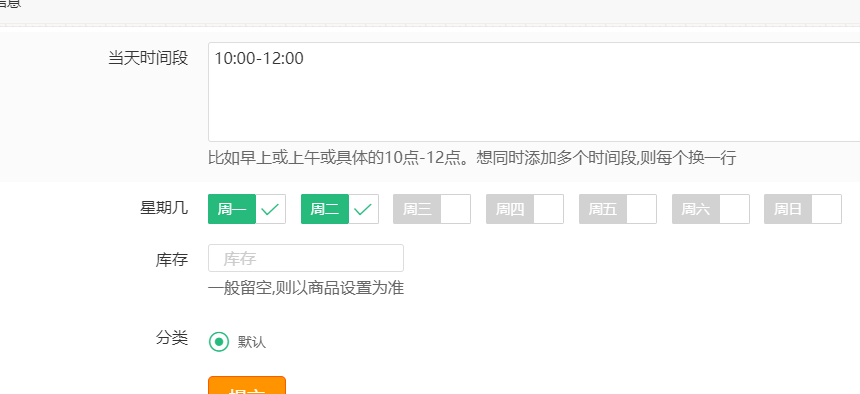 促销商城 预约服务模型 发布新内容 时间段分类修改 提示错误