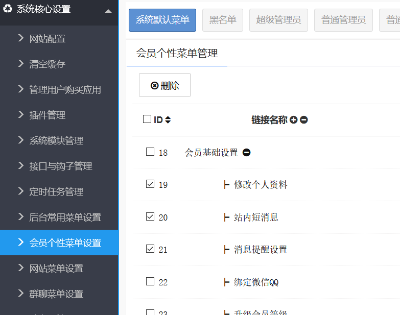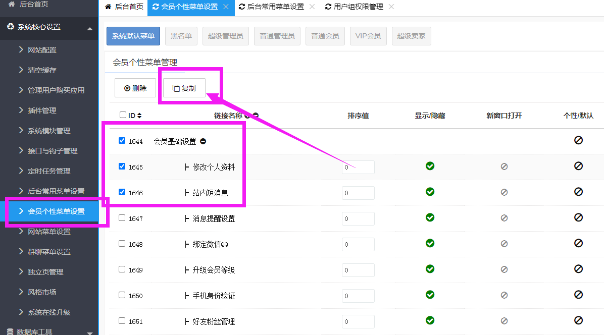 应个别用户提议,后台会员个性菜单管理也增加了菜单的批量复制功能