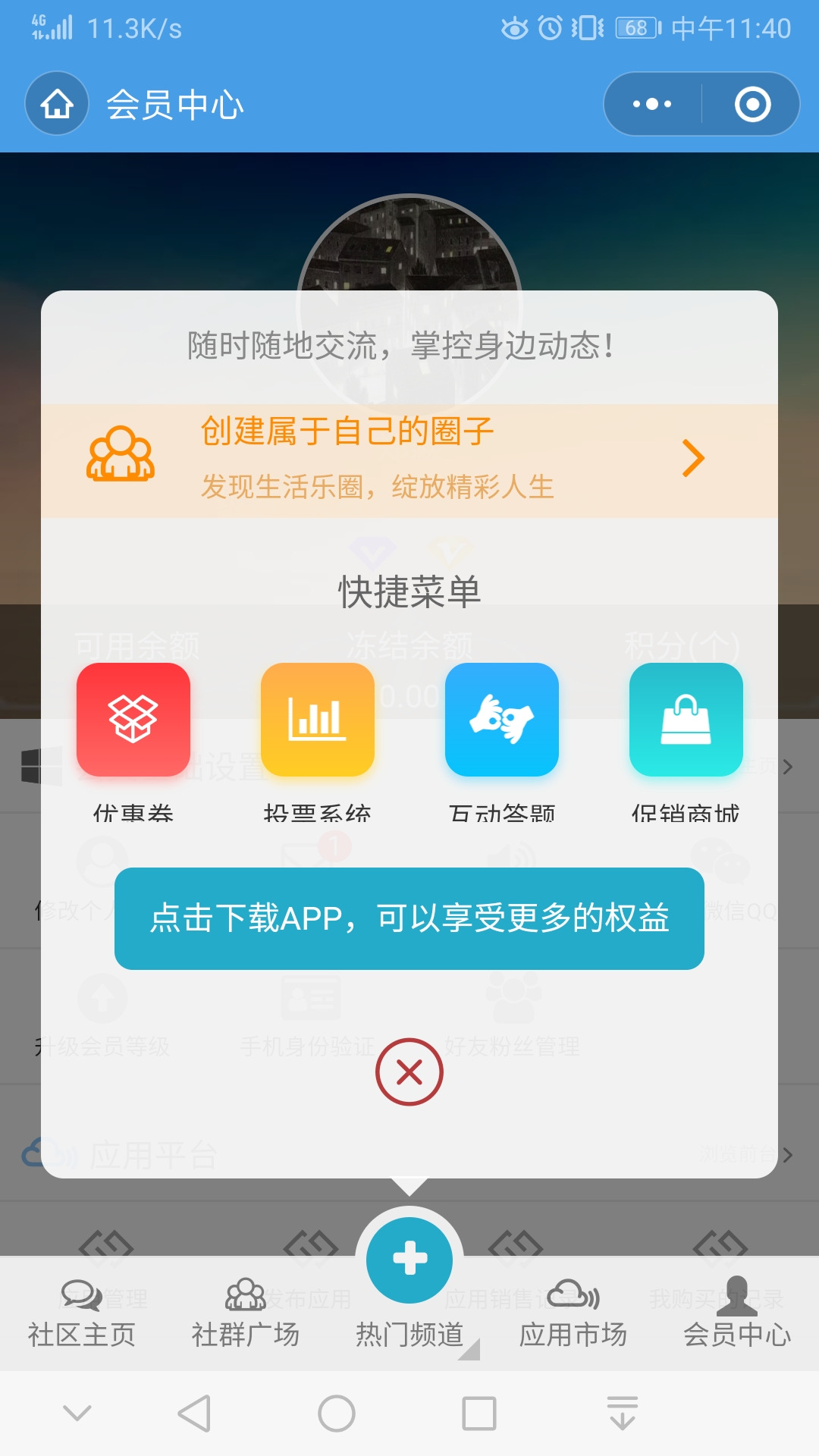 底部菜单点会员中心后,再点中间+菜单