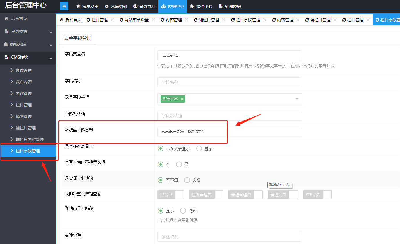 栏目字段里的不能