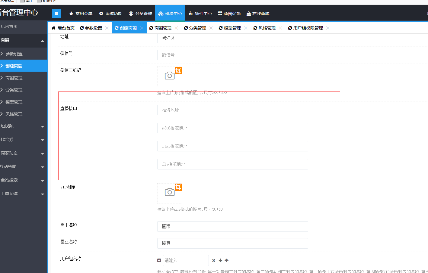 问下老大创建圈子,里边的直播接口 那四项地址怎么写的,一般用户他们不明白什么用的?