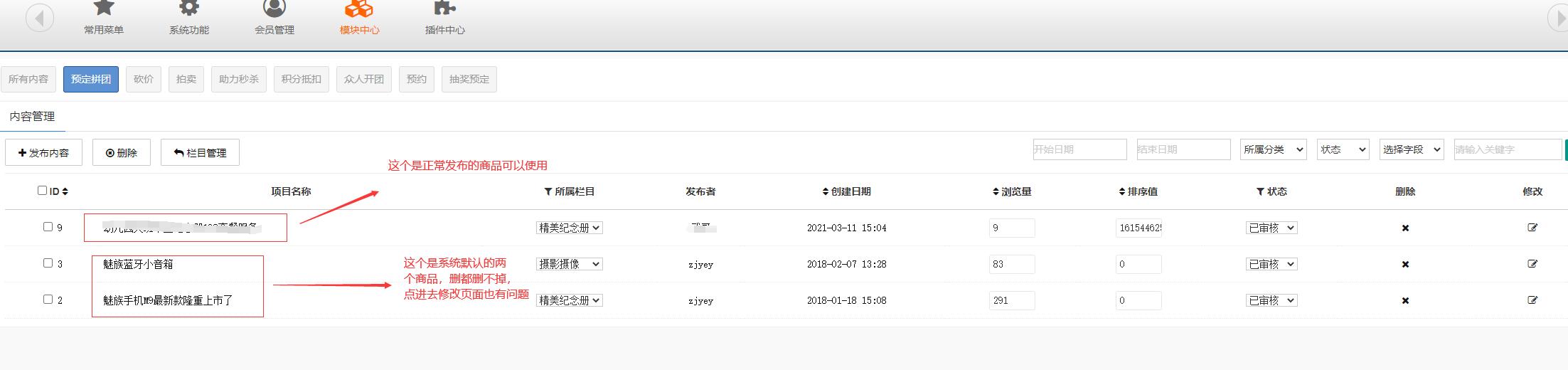 促销商城,预订拼团里面官方默认的两件商品删除不了,这个是什么情况导致。