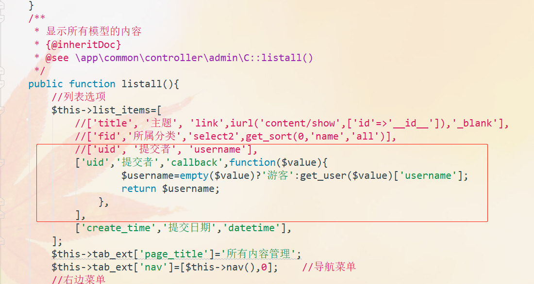 ['uid','提交者','callback',function($value){ $username=empty($value)?'游客':get_user($value)['username']; return $username; }, ],