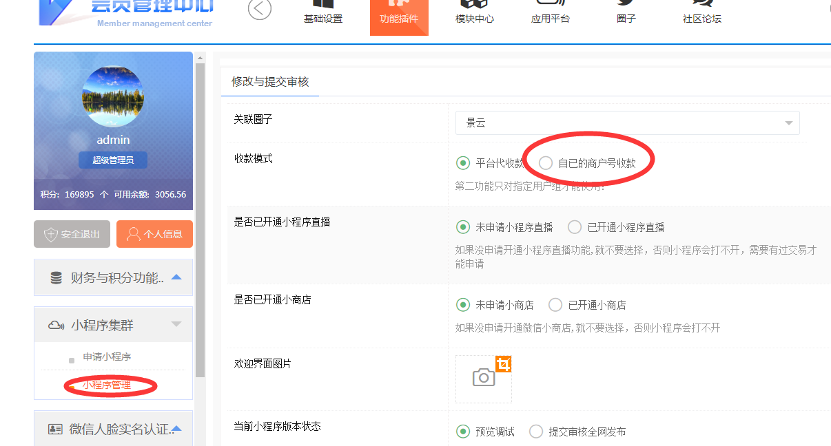 先要在修改提审那里,启用收款功能。前提需要后台修改其所在用户组有权限设置