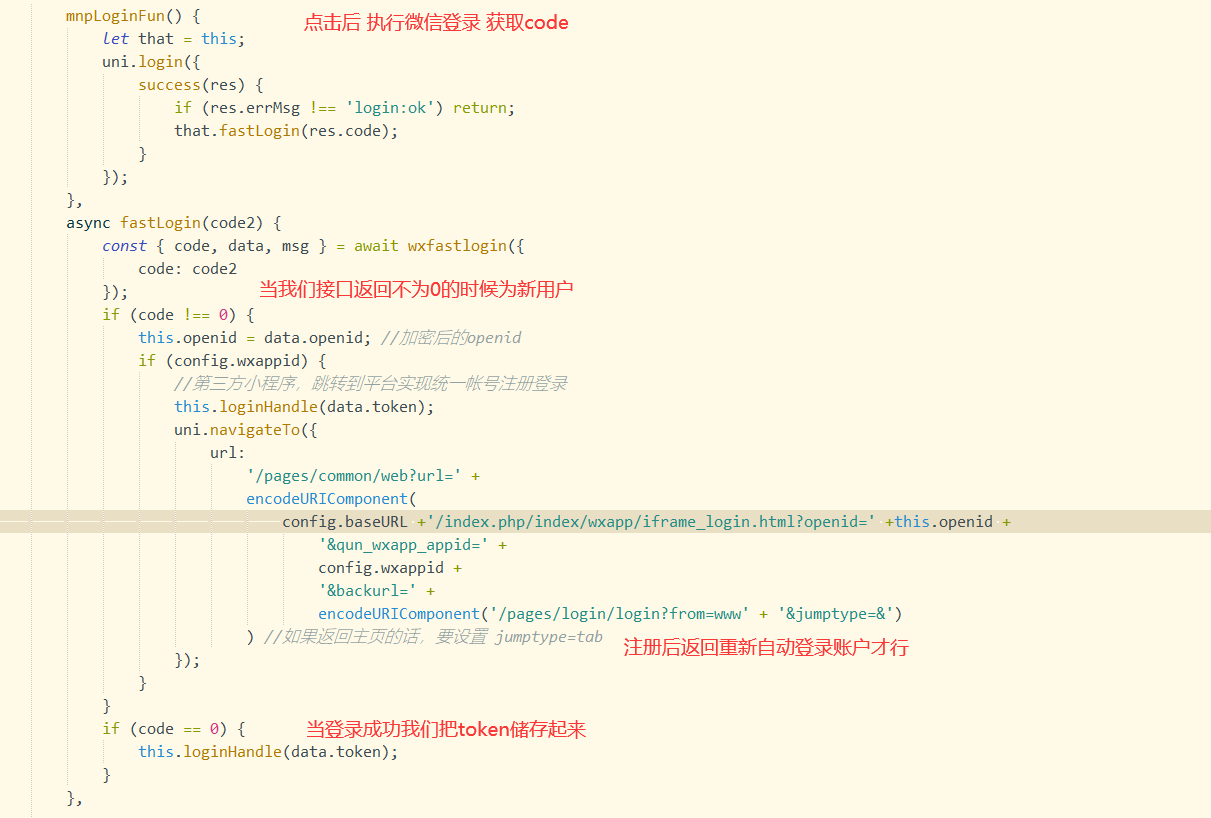 当是新用户的时候就跳转到 套壳的 /pages/common/web 访问 index.php/index/wxapp/iframe_login.html做账户捆绑操作 返回跳转到/pages/authorize/login?from=www 再继续执行登录 这里是关键点 要继续执行登录不然就是未登录