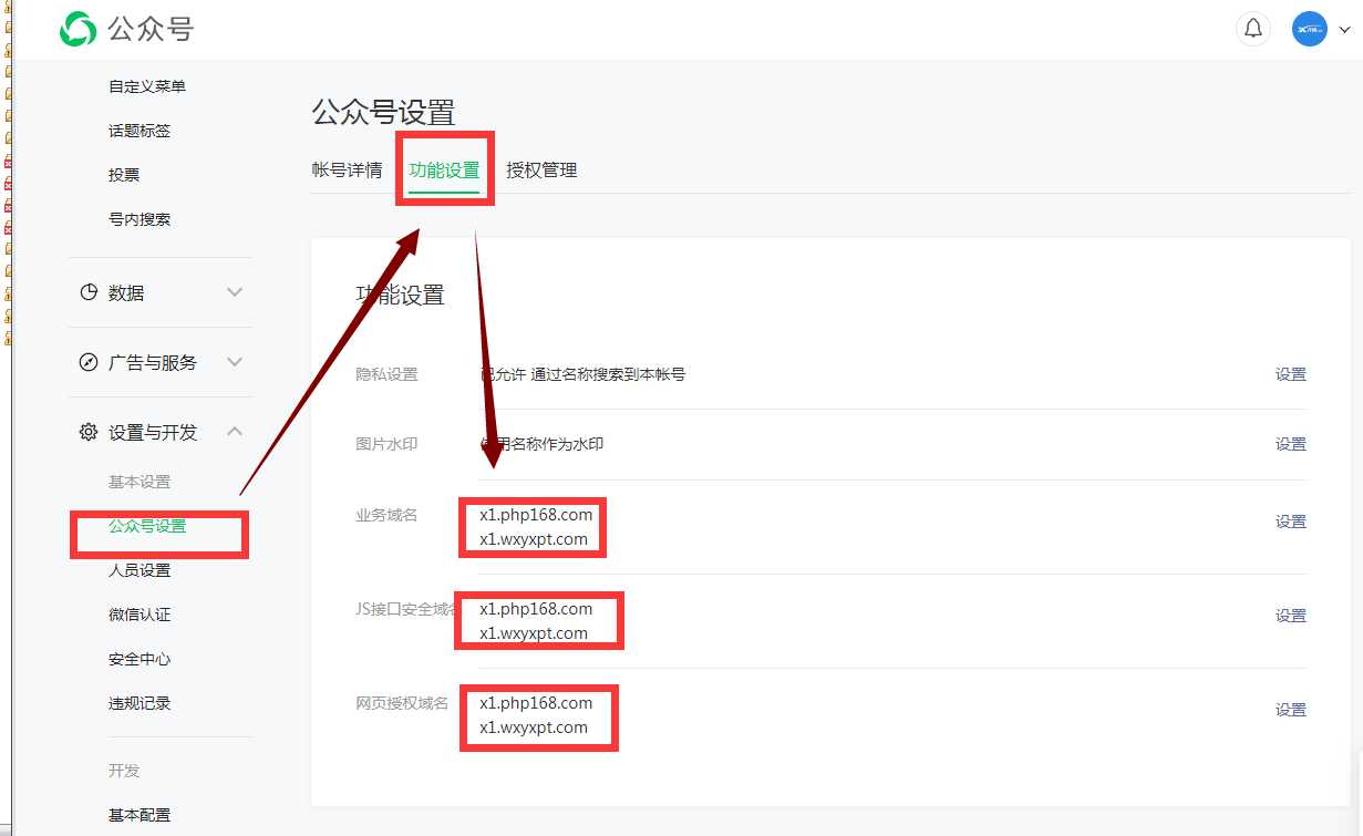 第一步,设置公众号,分别添加两个网站的域名