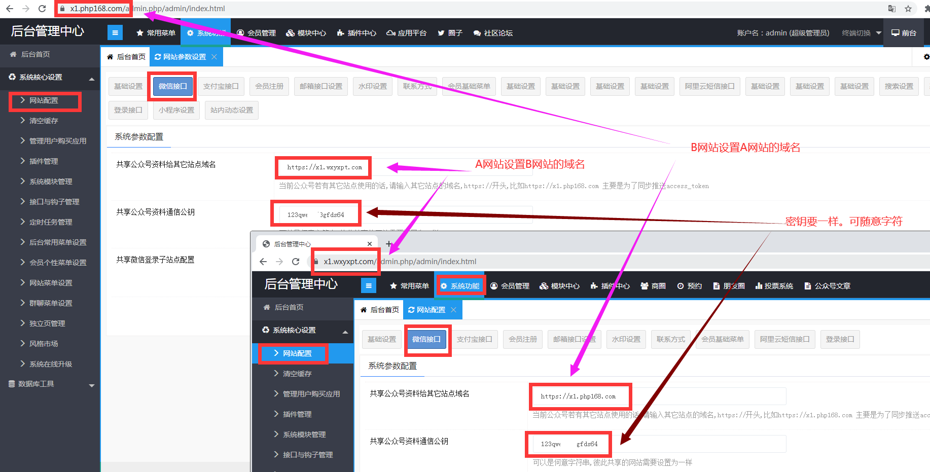 第二步,配置网站后台的公众号设置,如下图所示。