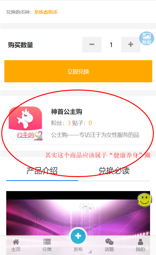 象这个链接中,商品是指定所属于“健康养身”商圈,但是商品详情底部显示的圈子却是“神首公主购”这个商圈。这非常影响圈主推广,会把用户推广到另一个圈子去了。