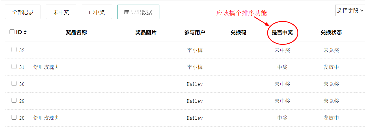 中奖记录中应该搞个排序功能,不然不好查看谁中奖了。