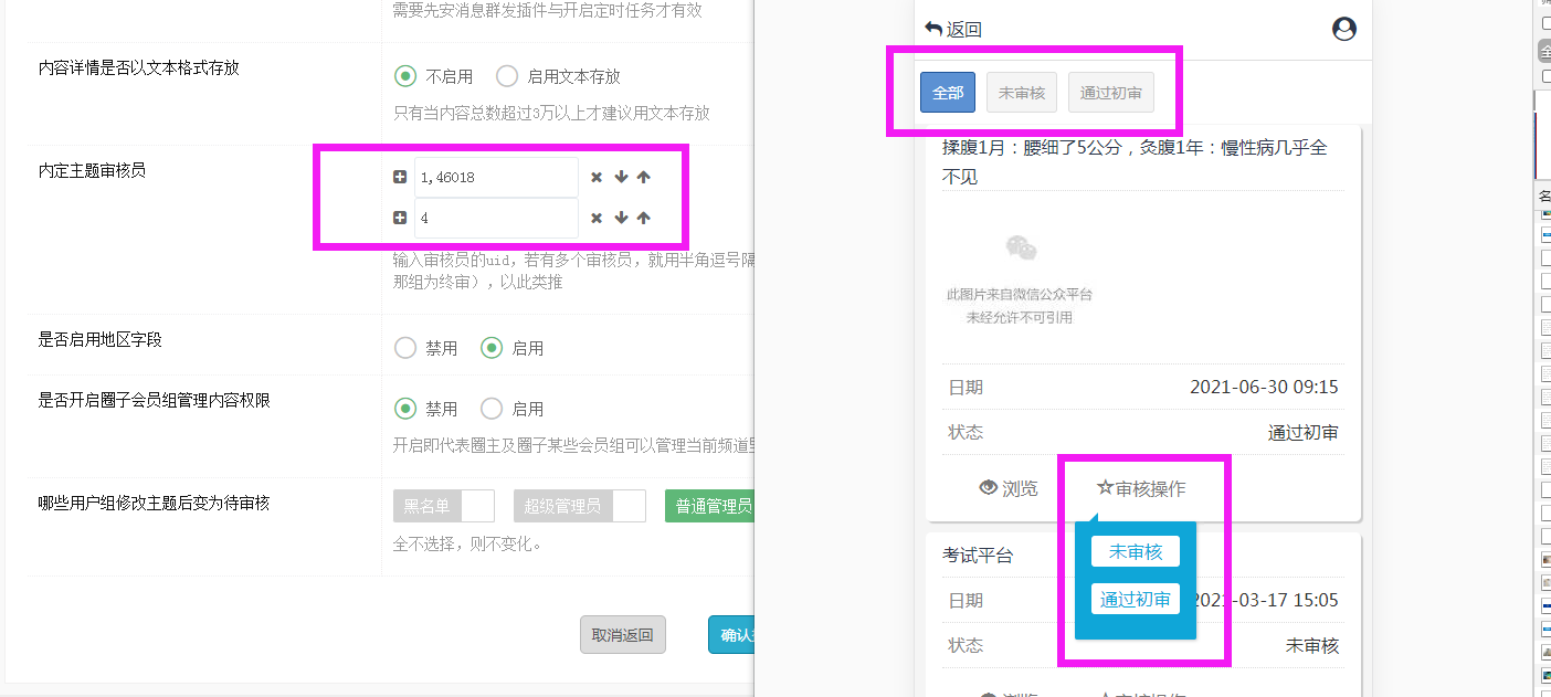 如下图所示,可以根据不同的频道,设置多级审核机制。