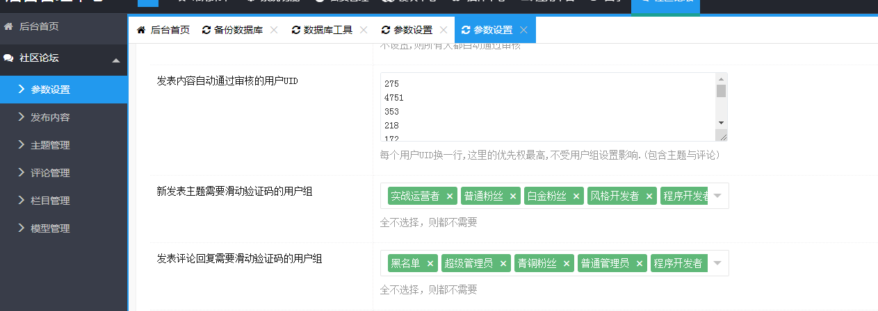 如下图所示,后台可以设置哪些用户组需要滑动验证码才能发表主题与回复。