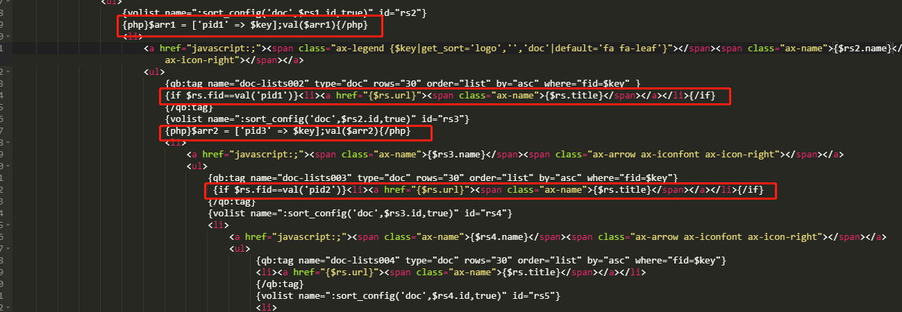 {php} //先在php标签里定义一个数组,把你的变量当作key然后赋值value,多个变量就逗号排开 $arr = ['pid1' => 2222222222]; //然后把数组塞进val里 val($arr); {/php} {qb:tag ... } {:val('pid1')} {/qb:tag}