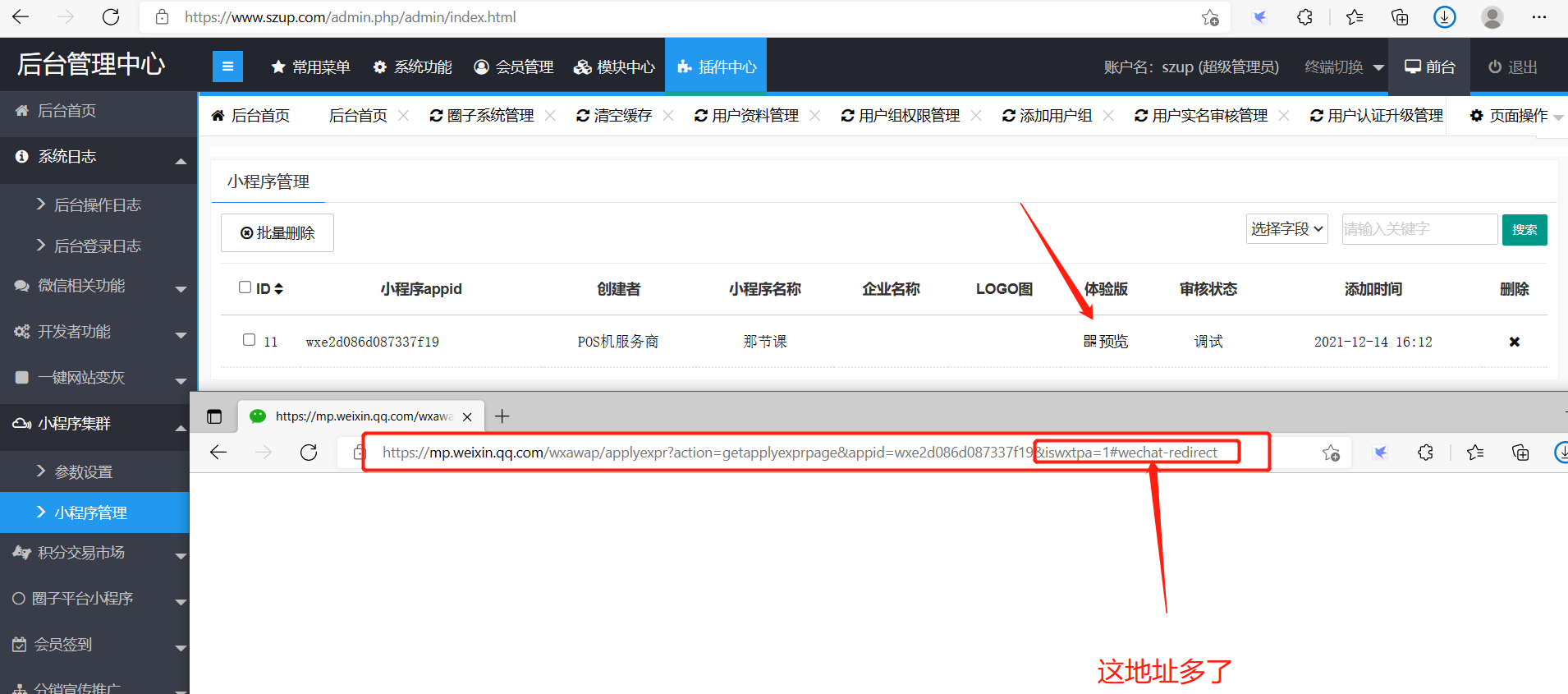 测试地址:https://www.szup.com/member.php/member/plugin/execute/plugin_name/wxopen/plugin_controller/info/plugin_action/add.html
