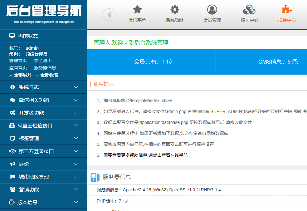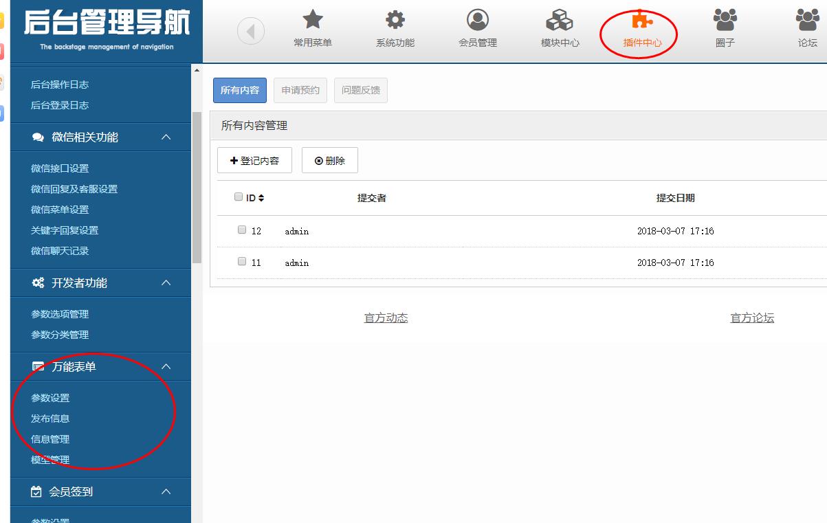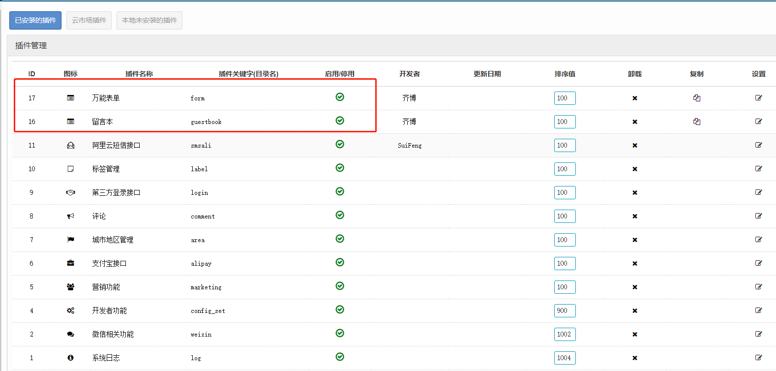 云市场安装了万能表单和留言板插件,后台插件中心没有显示。如果要配置,怎么配置呢