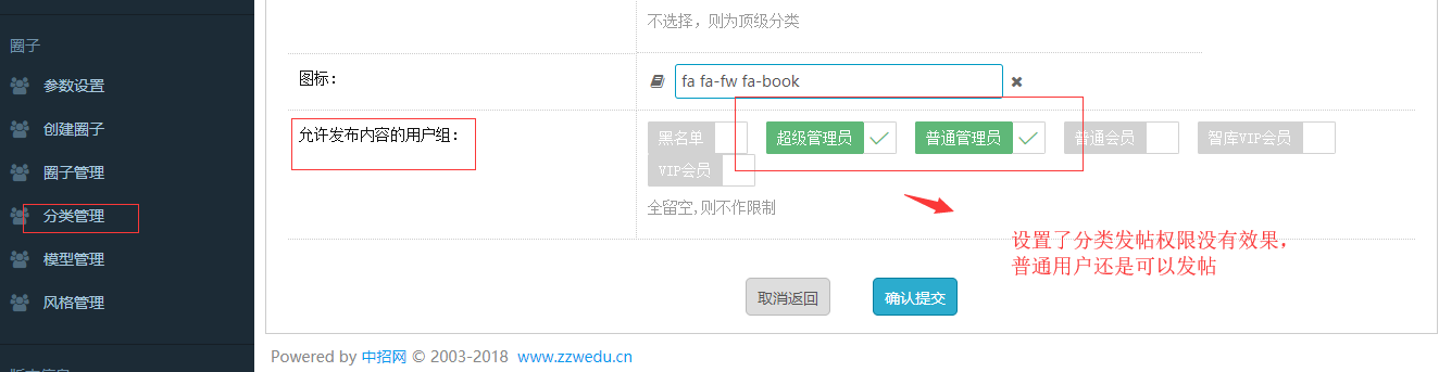 圈子的分类设置是无效 的。你要在分类的参数设置那里,