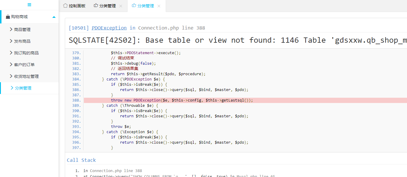 SQLSTATE[42S02]: Base table or view not found: 1146 Table 'sjz_6cang_cn.qb_config' doesn't exist