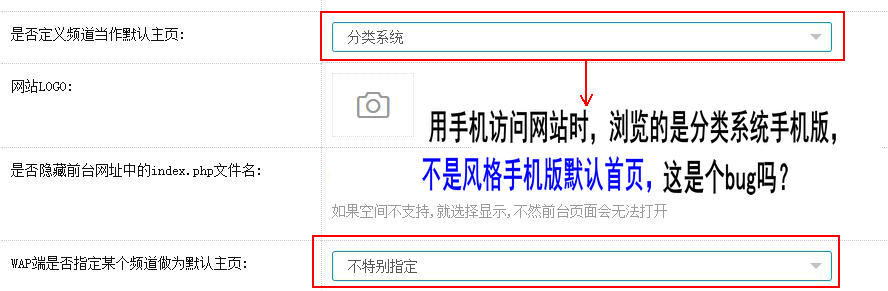 后台如下图定义频道当作默认主页后,用手机访问网站时,浏览的页面,是分类系统的,手机版主页,这是个bug吗?像我这样设置时,用手机访问网站时,浏览的页面,是风格默认手机版主页才对吧?