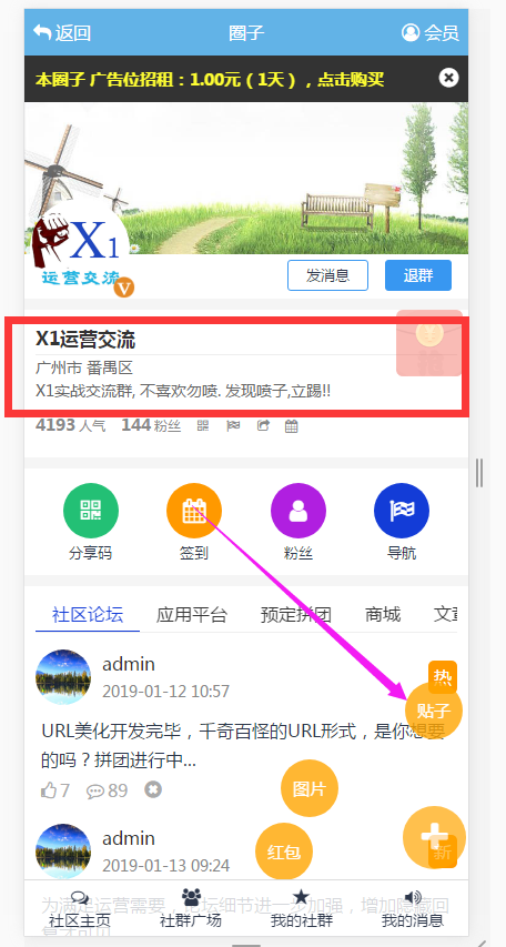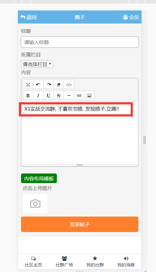 手机版圈内发贴按键,点击发贴,内容调出了商家介绍,也就是说任何一个会员就可以修改你的圈子介绍