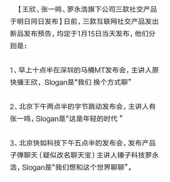 果壳电子CEO顾晓斌昨日晚间在朋友圈发图,第一张图片主要内容为“王欣、张一鸣、罗永浩旗下公司三款社交产品于明日同日发布”,图片内容还包括三款产品发布的时间、地点以及产品Slogan。另一张图片则配上了一张黄历图,显示今日“忌开市、动土”。 马化腾今日凌晨对其朋友圈做出评论:“看到这样我们就放心啦!”