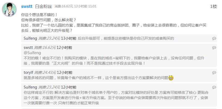@admin 你这个想法很好,但我不是来怂恿你马上就这么去做的,当务之急不是这个,你当务之急是要让现在多有的功能模块的功能完善,而不是都是半成品,让现在已经用了X1系统的站长的网站让没有会员使用了的满意度不说达到100%,而要达到80%,然后很多人都会自己来找你们卖套餐似服务,目前,X1的基础架构都好问题多多,开发这个框架1年多了,这个速度有点慢,谁能预测到明年互联网的新模式会是神马样子?官方是不是能跟上互联网新发展的脚步?