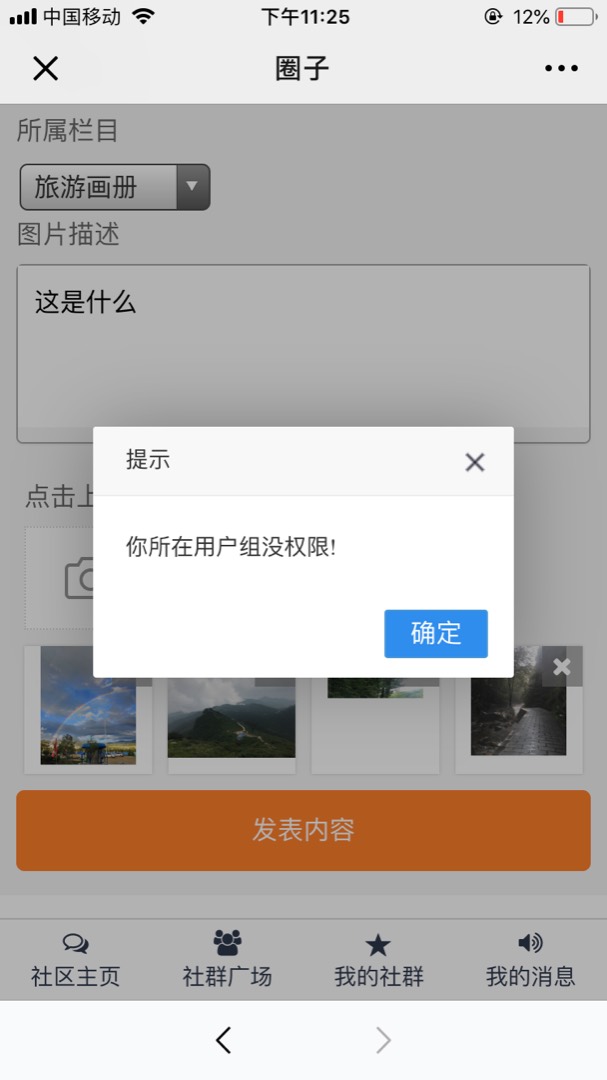 这确实是个大BUG,图片都已经上传完了才提示没有权限发布,这是很傻的做法。