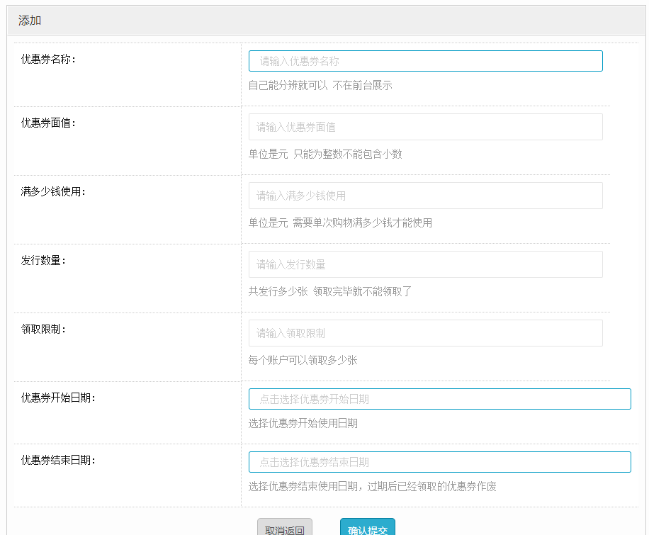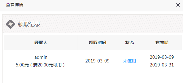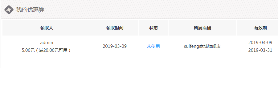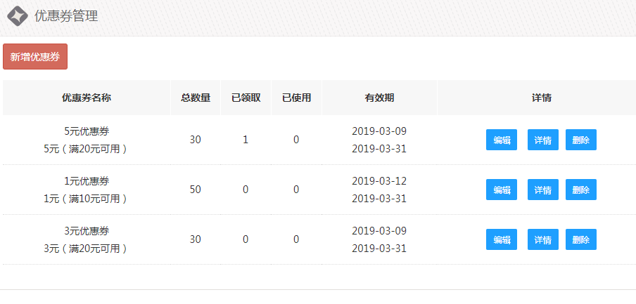 增加了优惠券功能。优惠券由商家自助发放 可以设置各种参数 下面有图展示,优惠券分 未使用 已使用 过期和使用中。假如订单到期没有付款优惠券会返回给用户。