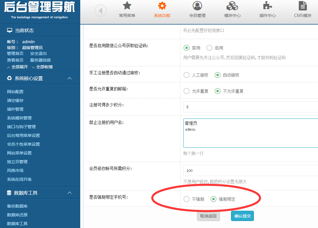手机大家都觉得很重要, 现在后台增加了强制绑定的开关.