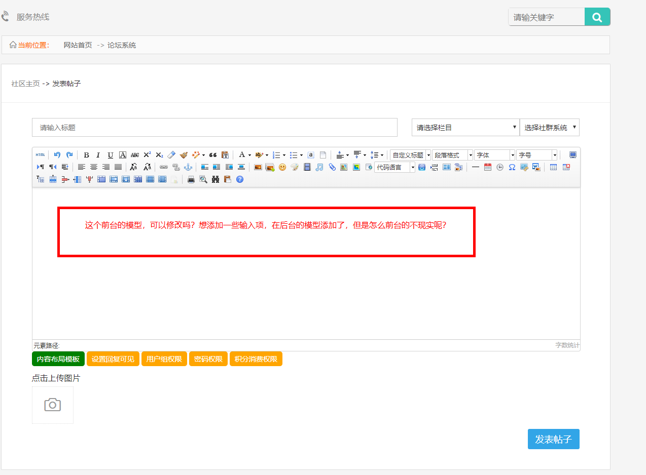 前台 的话,需要 你自己改模板。否则就加链接跳到会员中心去发布==》论坛,圈子,cms 的前台都需要自己改模板或者跳转到链接跳到会员中心去发布 吗??